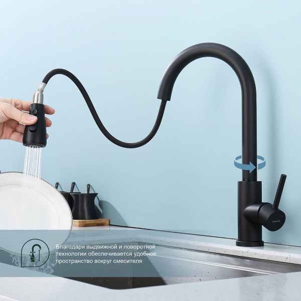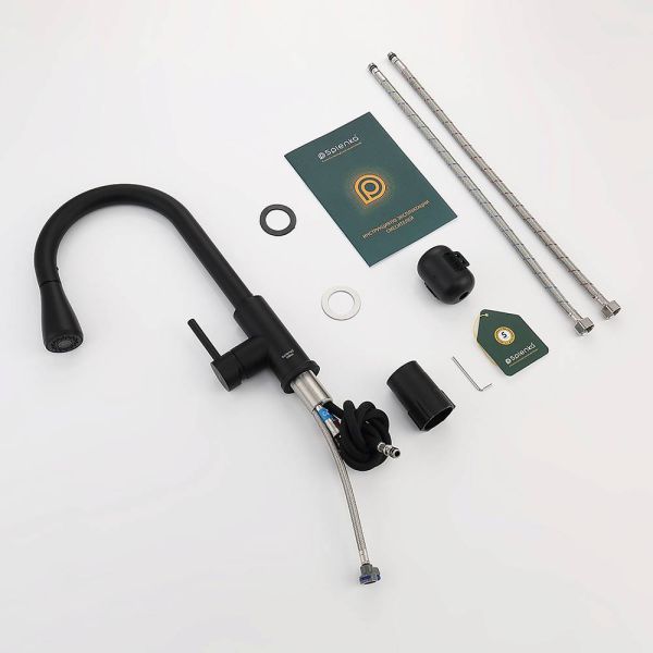 Смеситель для кухни с выдвижным изливом Splenka S203.49.06. Цвет: черный. Смеситель для кухни с выдвижным изливом из нержавеющей стали. Излив смесителя оснащен аэратором, что обеспечивает экономичный расход воды. Излив поворотный и выдвижной. Механизм смесителя: керамический картридж. Управление рычажное. Подводка гибкая 1/2. Режимы лейки: 2. Данная модель отличается своей долговечностью и хорошим качеством.