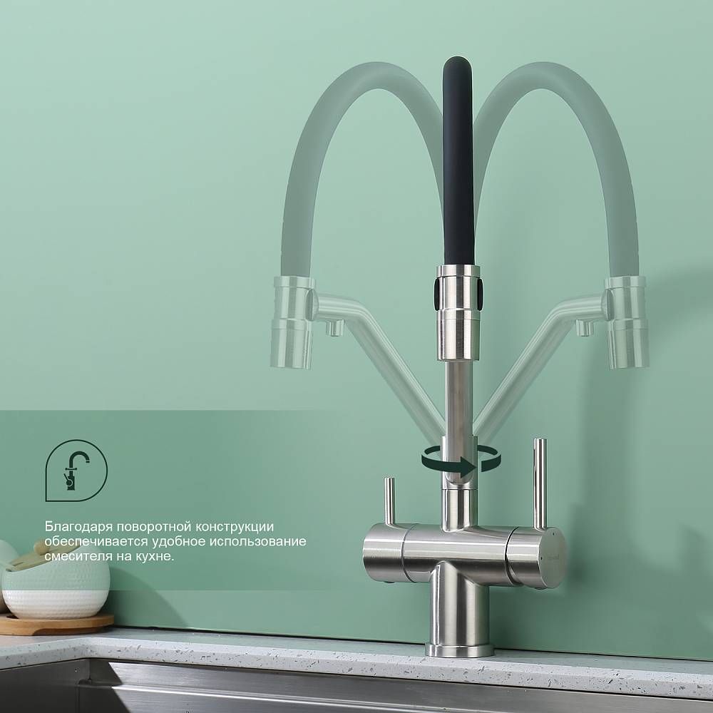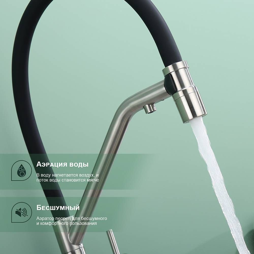 Splenka S70.62.05 Смеситель для кухни со съемным изливом на магните и подключением фильтра питьевой воды. Смесители для кухни с гибким изливом имеют необычный внешний вид и особую конструкцию. Нижняя часть представляет собой обычный однорукий латунный смеситель с регулировкой холодной и горячей воды, регулировкой напора и переключателем на фильтр с другой стороны. Верхняя часть это гибкий излив из пищевого силикона. С его помощью можно самостоятельно регулировать глубину выноса и высоту излива, что решает проблему при наполнении раковины посудой. Смеситель поворачивается на 360 градусов и оснащен отдельным выходом для фильтрованной воды. Переключение на воду из фильтра осуществляется переключателем с керамическим картриджем.
