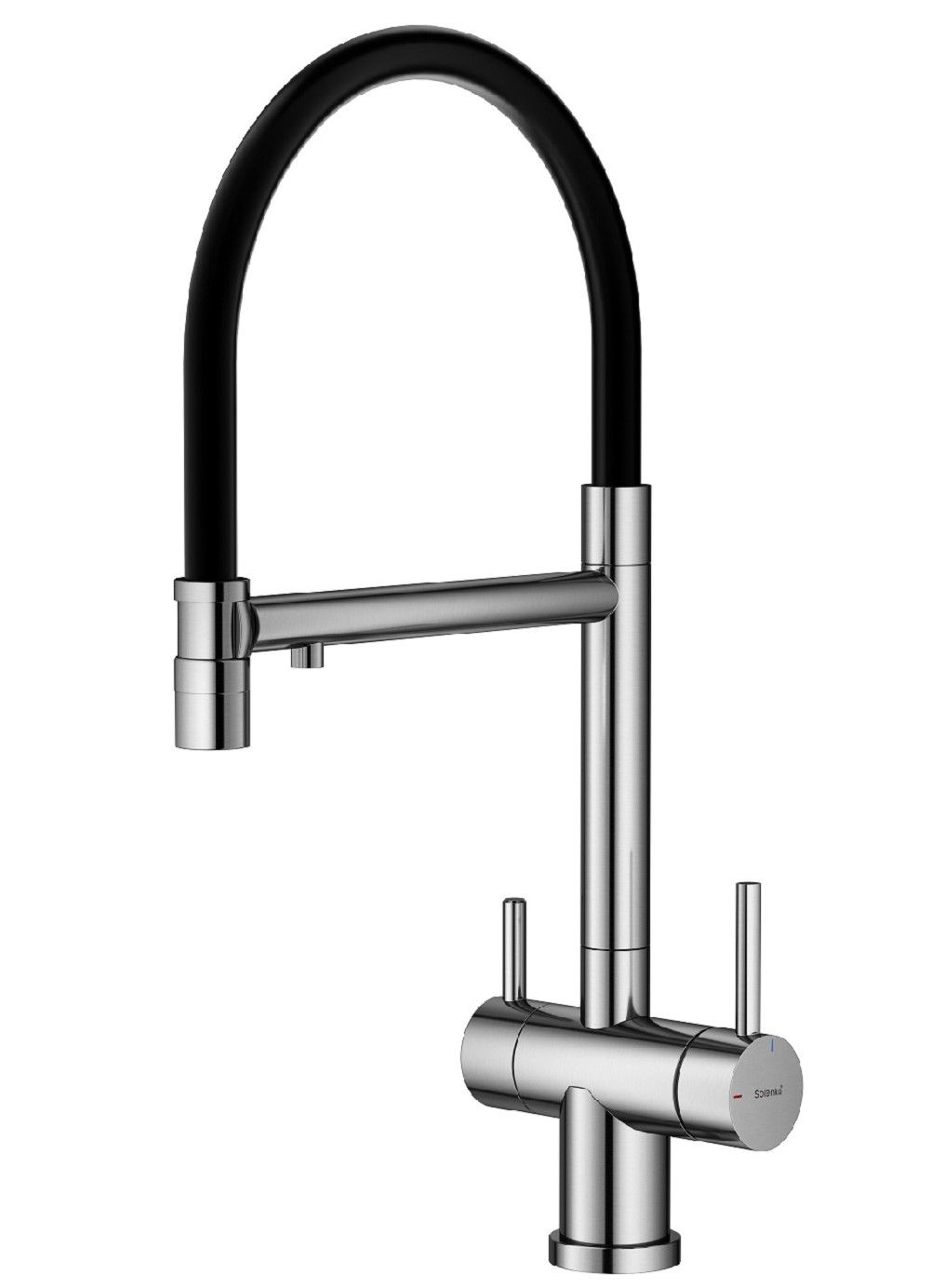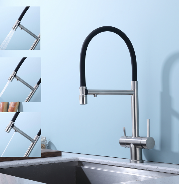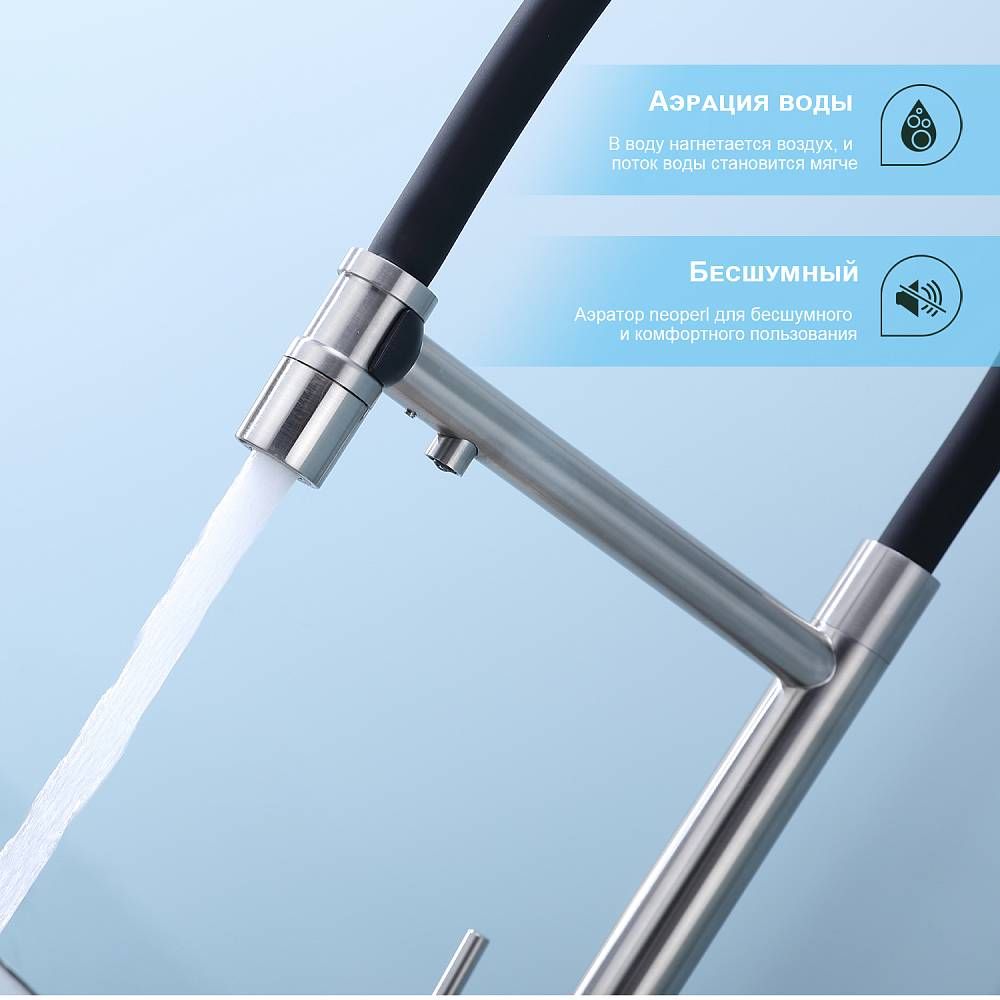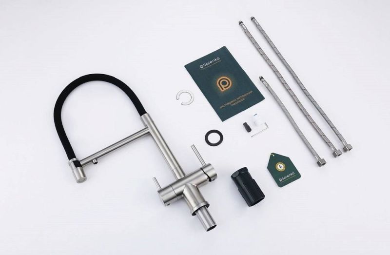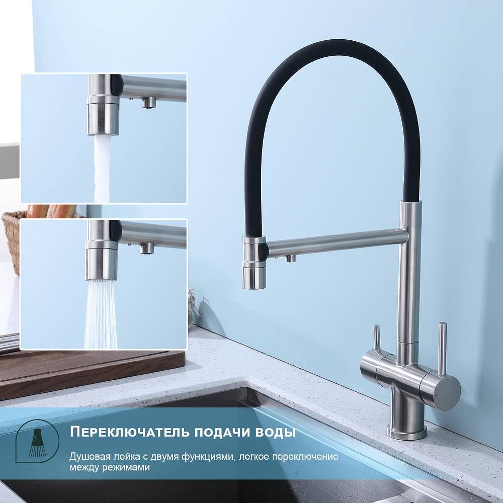 Splenka S70.63.05 Смеситель для кухни со съемным изливом на магните и подключением фильтра питьевой воды. Смесители для кухни с гибким изливом имеют необычный внешний вид и особую конструкцию. Нижняя часть представляет собой обычный однорукий латунный смеситель с регулировкой холодной и горячей воды, регулировкой напора и переключателем на фильтр с другой стороны. Верхняя часть это гибкий излив из пищевого силикона. С его помощью можно самостоятельно регулировать глубину выноса и высоту излива, что решает проблему при наполнении раковины посудой. Смеситель поворачивается на 360 градусов и оснащен отдельным выходом для фильтрованной воды. Переключение на воду из фильтра осуществляется переключателем с керамическим картриджем.
