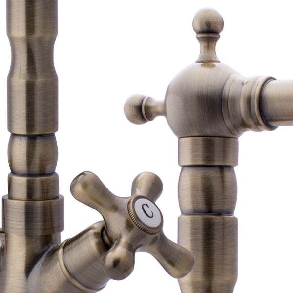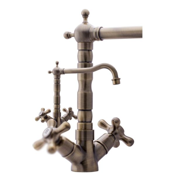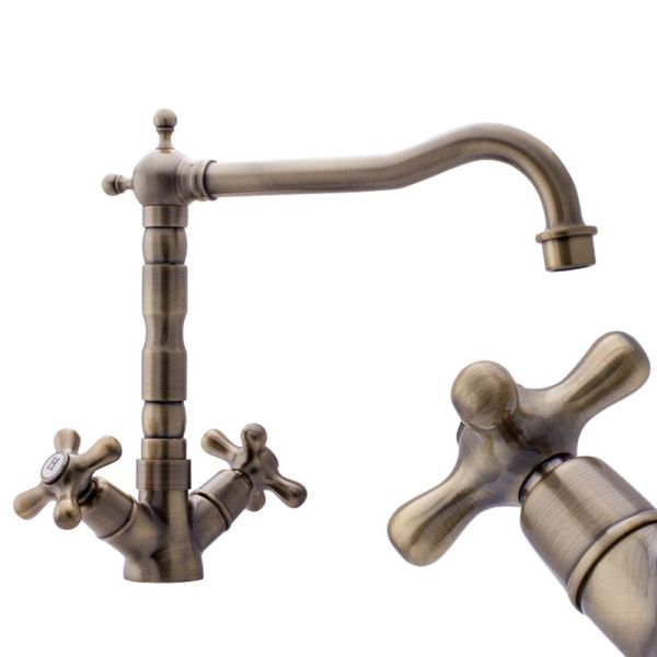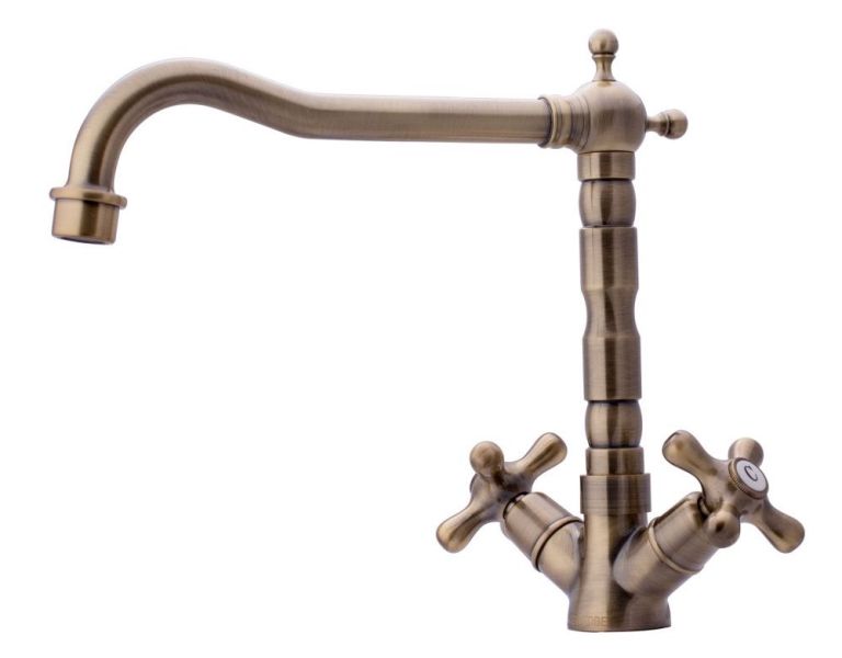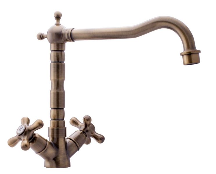 Смеситель для кухни двухрычажный в классическом стилеИзлив с поворотом 360 градусов.Керамический картридж Sedal.Аэратор Neoperl.Гибкая подводка SoftPEX.Гигиенически стабильная латунь с высоким содержанием меди.Цвет: бронза