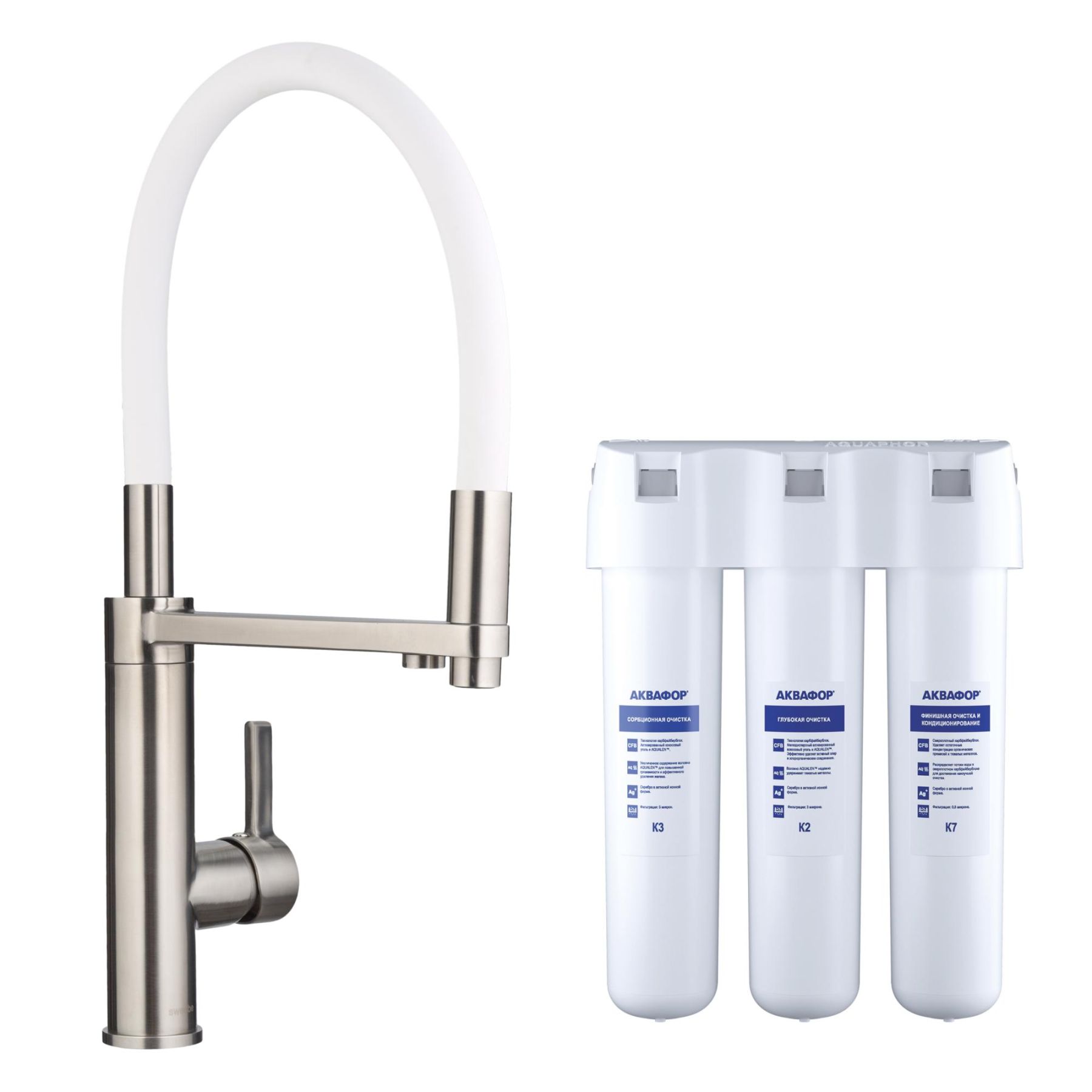 Смеситель для кухни Swedbe Selene Plus 8641K в комплекте с фильтром Аквафор Кристалл нержавеющая сталь/белый
