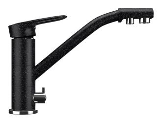 Высокоэргономичный кухонный смеситель с дополнительным краном для подключения фильтрованной воды, оснащенный кран-буксой с керамическими пластинами. Реализован тройной подвод воды через один излив: холодная, горячая и фильтрованная. Переход с одного подвода на другой производится поворотом рычага. Набор для соединения с фильтром входит в комплект. Система фильтрации приобретается дополнительно и монтируется под мойку, специальный индикатор сообщает о необходимости замены картриджа. Материал корпуса выполнен из высококачественной латуни, а окрашивание под искусственный камень в цвет мойки ULGRAN выполняется на собственном производстве, что позволяет идеально попасть в фирменный цвет ULGRAN. В качестве керамического картриджа используется известный бренд Wanhai диаметром 35 мм с высокой пропускной способностью в 500 тысяч циклов открывания-закрывания. На подвижные части картриджа Wanhai нанесена специальная невымываемая силиконовая смазка, а керамические пластины изготовлены из 96 процентов оксида алюминия, что, в сочетании с высоким качеством шлифовки обеспечивает долговечность, надежность, плавность хода рукоятки. Смеситель оборудован съемным пластиковым аэратором для экономии воды и поворотным изливом на 360 градусов. В комплектацию входят: керамический картридж Wanhai, гибкая подводка, комплект крепежных элементов, кран-букса с керамическими пластинами для дополнительного излива для фильтрованной воды, набор для подсоединения фильтра питьевой воды (гибкая подводка + переходник-цанга), технический паспорт и гарантийный талон.Заводская