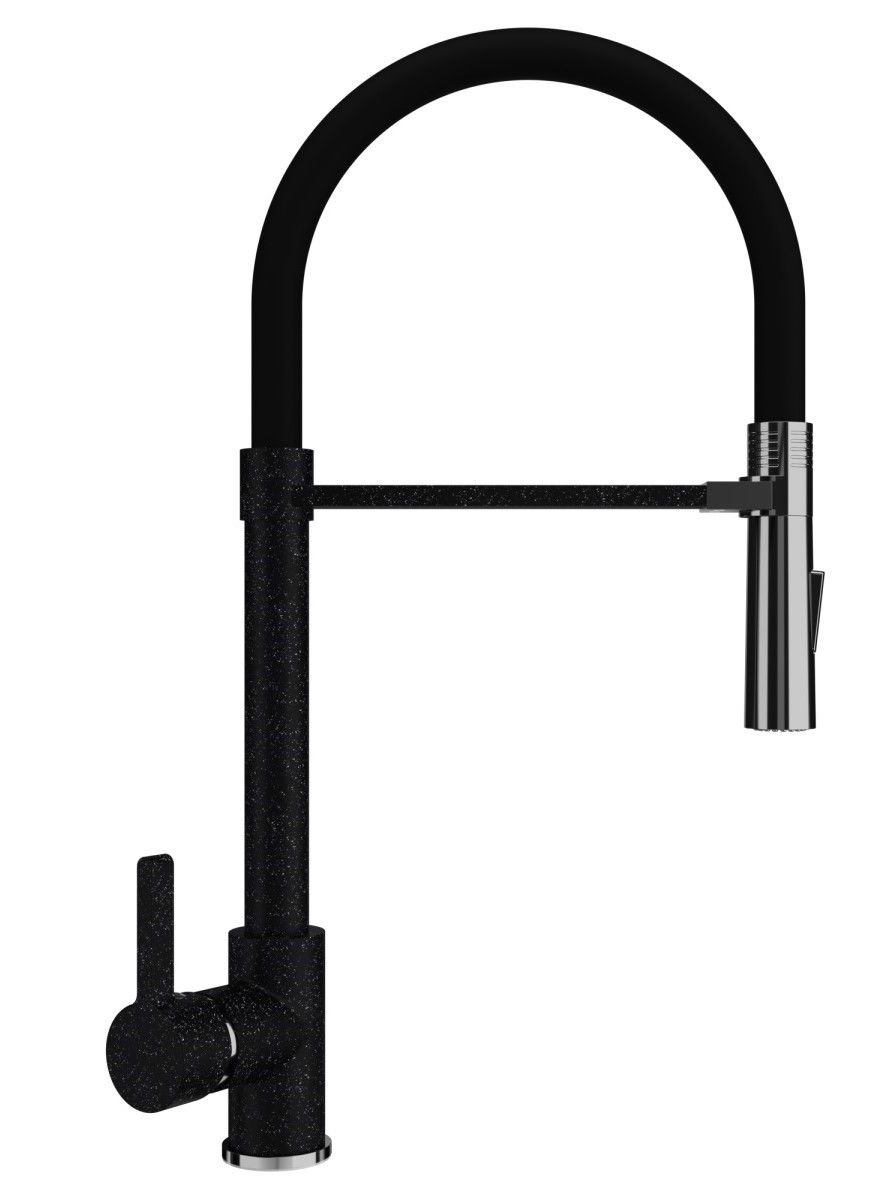 Смеситель ULGRAN U-024 – это стильный и современный кухонный смеситель с высоким гибким изливом черного цвета. Материал корпуса выполнен из высококачественной латуни, сверху корпус смесителя имеет специальное черное матовое покрытие.