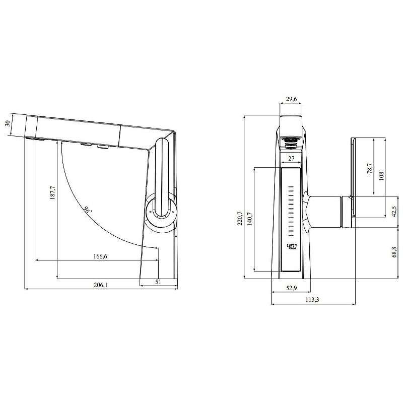 Смеситель датского производителя Black&White в цвете хром. Изделие реализовано в минималистичном дизайне и изготовлено из сантехнической латуни, что увеличивает срок службы и исключает возможность появления коррозии. В нижней части корпуса расположен дисплей с показаниями температуры воды с соответствующей подсветкой температурного режима. Для его работы не требуется электричество- он работает от машины постоянного тока, при прохождении через него потоков воды. Управление происходит через керамический картридж большой пропускной способности. Важным функциональным элементом можно отметить вытяжной излив с поворотным аэратором, на котором также дополнительно есть функция изменения поток воды.