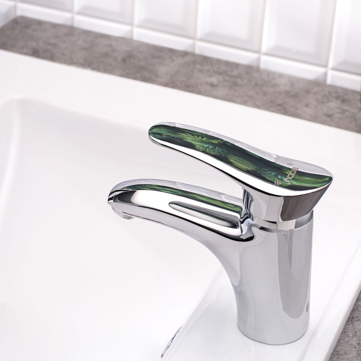 Однорычажный небольшой смеситель для раковины ТМ BOOU выполненный в привлека-тельном стильном дизайне и дополнит интерьер небольшой ванной комнаты.