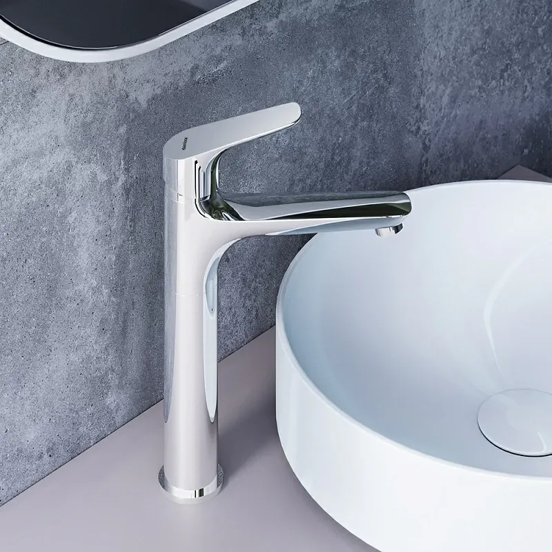 смеситель с высоким изливом идеально впишется в современный интерьер ванной комнаты с глубокой чашей, благодаря обширной зоне движения ручки управлять температурой воды будет легко и просто;
