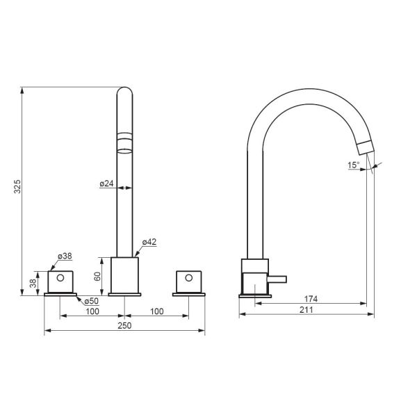 Корпус смесителя 3 шт.; излив 1 шт.; ручка 2 шт.; комплект соединения 1 шт.; гибкая подводка 2 шт.; инструкция изделия. Черный, врезной смеситель на раковину, состоит из трех отдельных секций, горячая и холодная вода поступает из отдельных секций, температура воды регулируется отдельными ручками независимо друг от друга, как на ретро смесителях