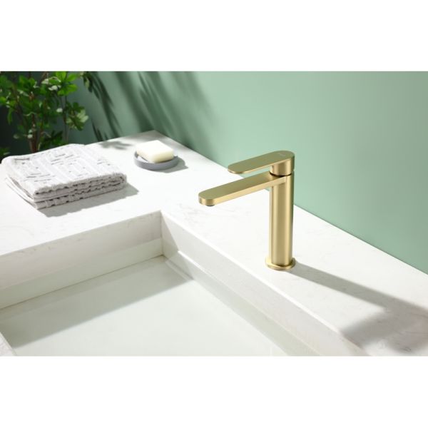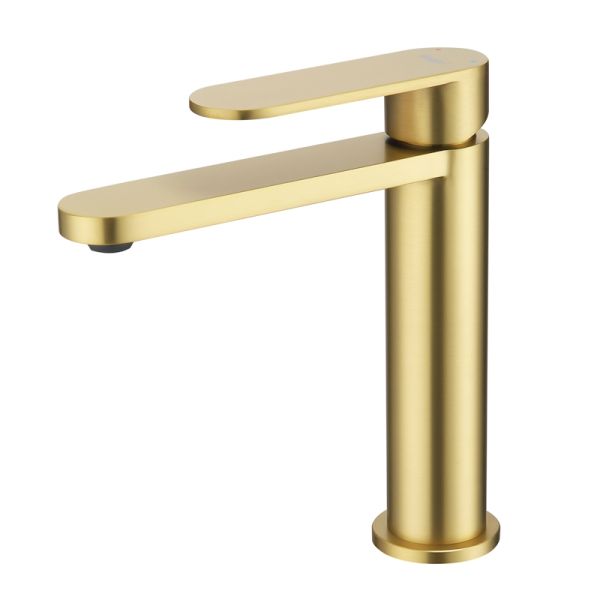 Смеситель для раковины R10.10.03. Однорычажный смеситель для раковины (для умывальника) в ванную, выполненный в цвете "золотой сатин" (матовое золото). Соответствует требованиям международного стандарта. Одна рукоять для регулировки воды. Аэратор для водопроводной воды Neoperl® с функцией самоочистки гарантирует одинаковый поток воды, сеточка рассеивает напор, вода смягчается. Смеситель устанавливается на гайке, нижняя часть смесителя вставляется в отверстие для монтажа и затягивается гайкой для фиксации. Данный смеситель для умывальника имеет надежный стационарный излив, не меняющий своего положении. Смеситель прекрасно смешивает потоки воды, а помимо этого обладает невысоки показателем шумов. Быстрый монтаж. Гарантия производителя 5 лет.