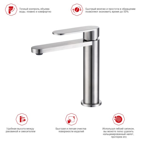 Смеситель для раковины R10.10.05. Однорычажный смеситель для раковины (для умывальника) в ванную, выполненный в цвете "сатин" (матовый хром). Соответствует требованиям международного стандарта. Одна рукоять для регулировки воды. Аэратор для водопроводной воды Neoperl® гарантирует одинаковый поток воды, сеточка рассеивает напор, вода смягчается. Смеситель устанавливается на гайке, нижняя часть смесителя вставляется в отверстие для монтажа и затягивается гайкой для фиксации. Данный смеситель для умывальника имеет надежный стационарный излив, не меняющий своего положении. Смеситель прекрасно смешивает потоки воды, а помимо этого обладает невысоки показателем шумов. Быстрый монтаж. Гарантия производителя 5 лет.