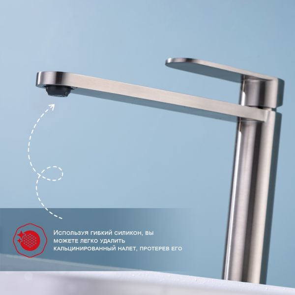 Излив оснащён аэратором, который помогает экономить воду, создавая мягкий и равномерный поток. Крепление смесителя осуществляется при помощи гайки, что обеспечивает надёжную фиксацию на раковине.