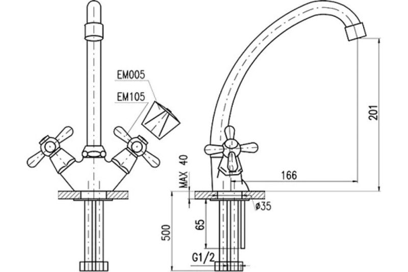 Кухонный смеситель для бойлеров с низким давлением Rav Slezak EM113.5/1, двухвентильный, с аэратором, изготовлен из высококачественной латуни, которая исключает какую-либо коррозию. Металлические рукоятки. Поворотный излив, 360 градусов, длиной 166 мм. Гибкие подсоединительные шланги. Гибкая подводка G1/2, длиной 500 мм. В комплекте смеситель, гибкая подводка и крепления.