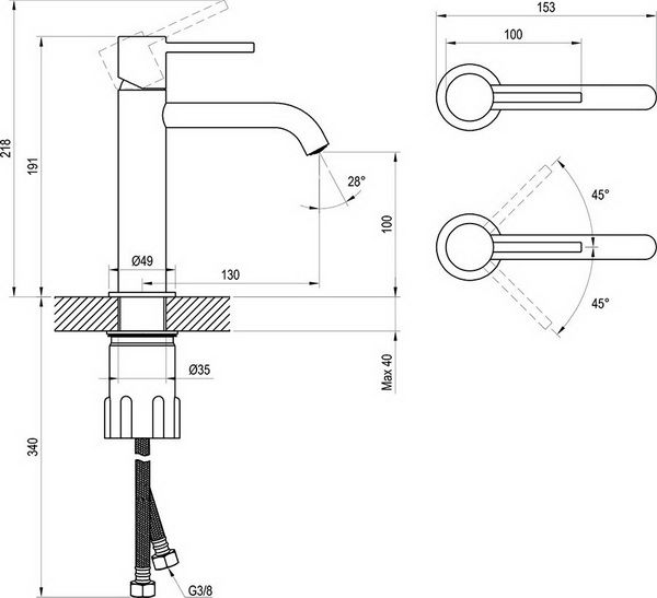 соединительные шланги: гибкие 450 мм, диаметр DN6, G3/8;