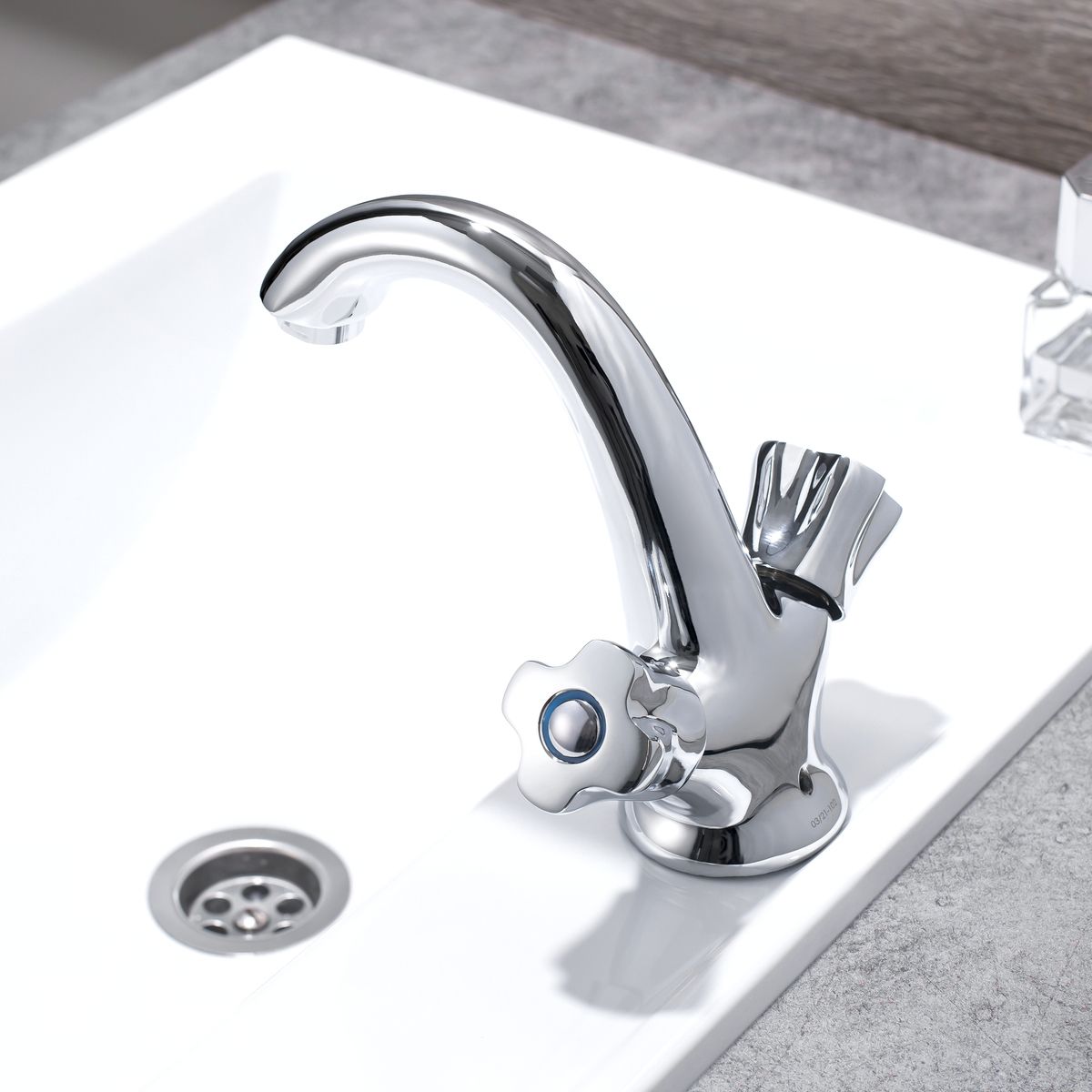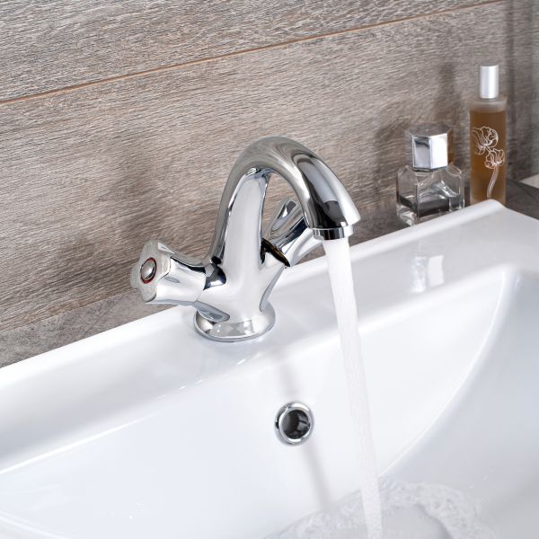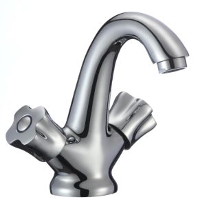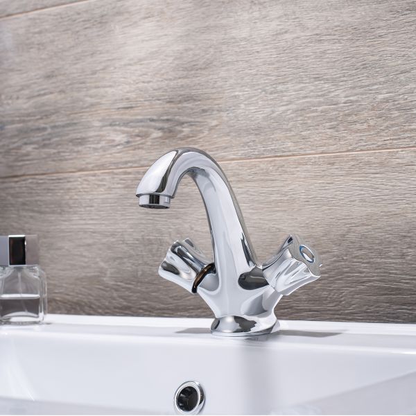 Привлекательный двуручковый смеситель для умывальника обладает удобными в использовании ручками регулирования температуры и напора воды.