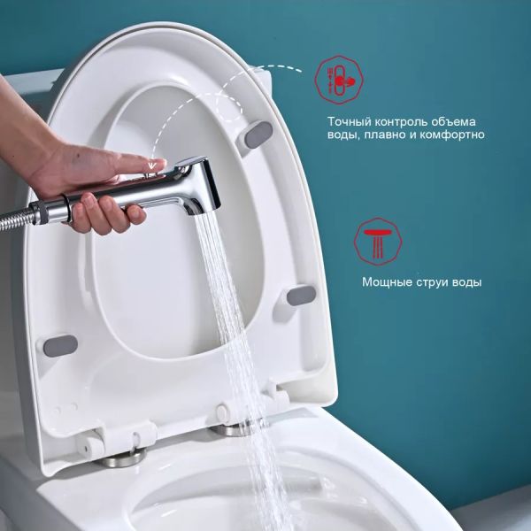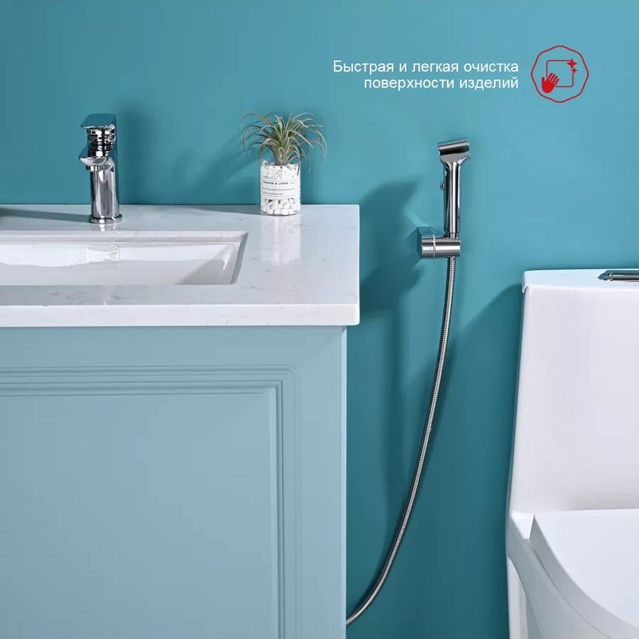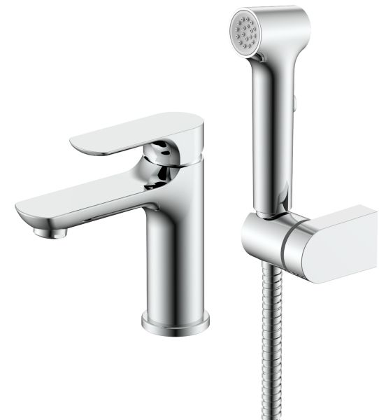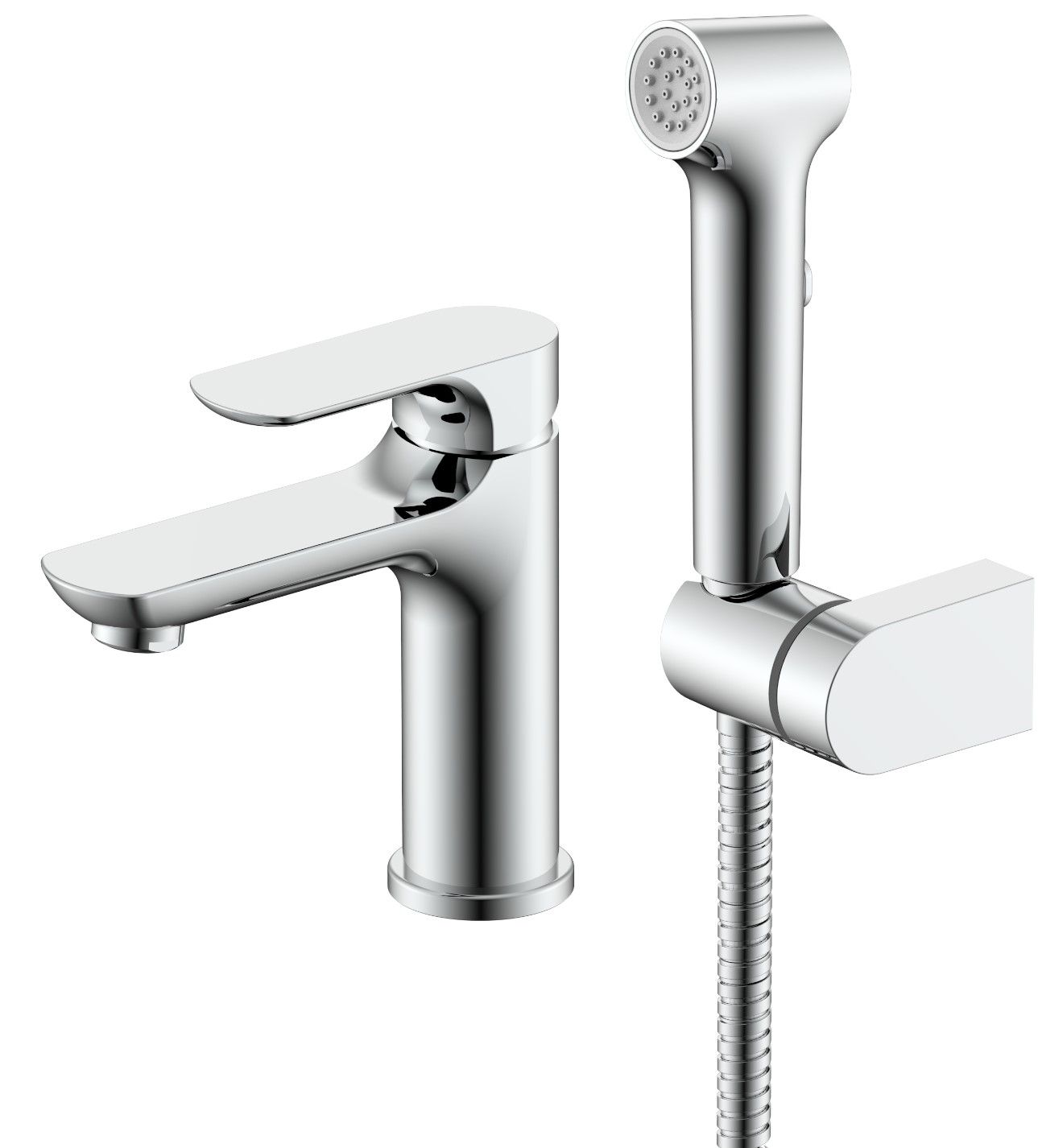 Смеситель для умывальника с гигиеническим душем, в цвете хром, лейка с регулировкой напора. Шланг и настенное крепление - держатель лейки в комплекте.