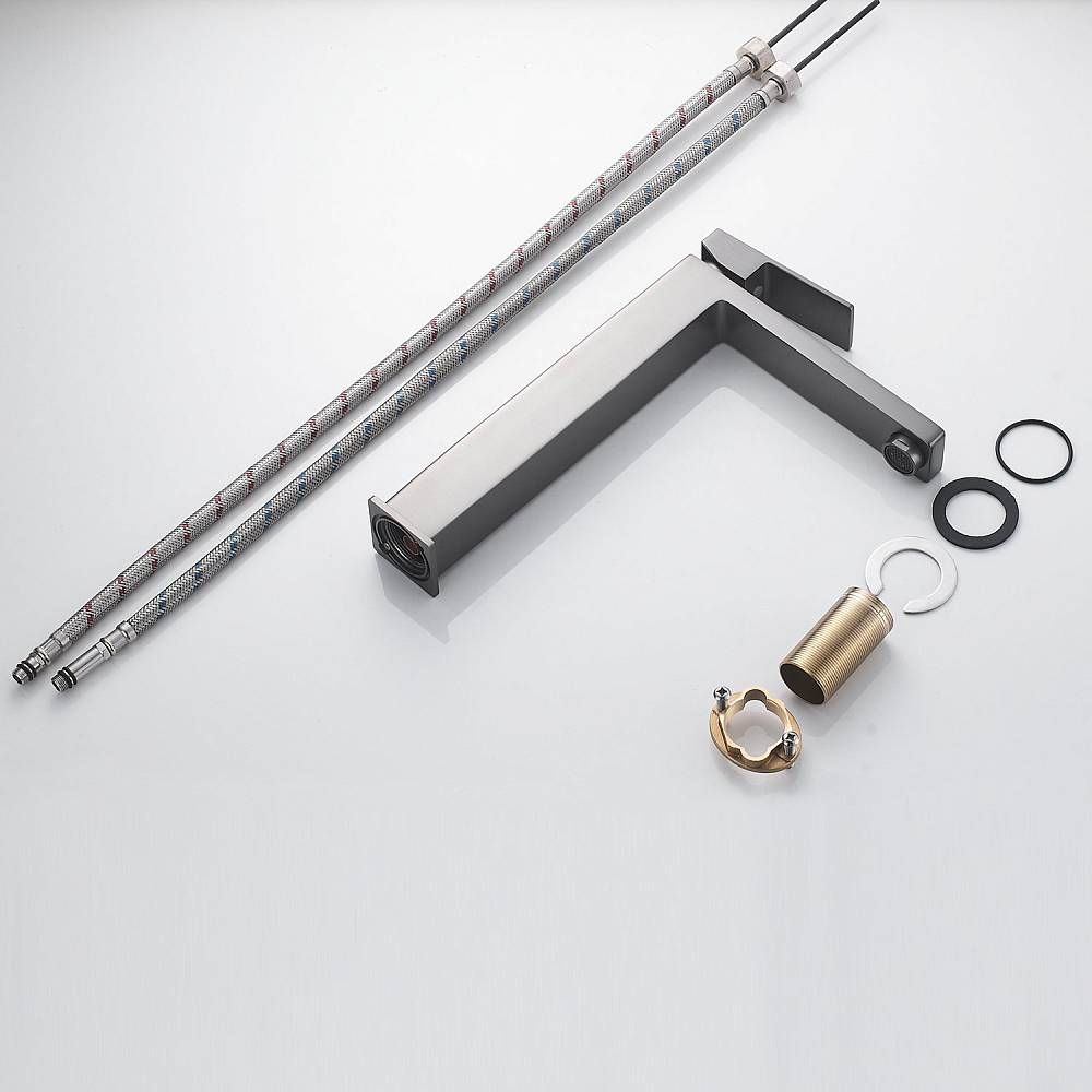 Смеситель для раковины Shevanik S9611T, оружейная сталь.Стилистика дизайна: Современный cтиль.Монтаж: на столешницу.Излив: традиционный, фиксированный.Подводка: гибкая, 1/2" .Материал: латунь.