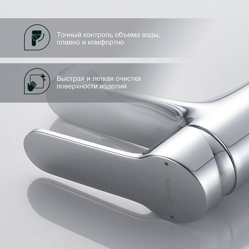 Смеситель для раковины Splenka имеет повышенную прочность корпуса. Соответствует требованиям международного стандарта. Одна рукоять для регулировки воды. Аэратор гарантирует одинаковый поток воды, сеточка рассеивает напор, вода смягчается. Смеситель устанавливается на гайке, нижняя часть смесителя вставляется в отверстие для монтажа и затягивается гайкой для фиксации. Данный смеситель для умывальника имеет надежный стационарный излив, не меняющий своего положении. Смеситель прекрасно смешивает потоки воды, а помимо этого обладает невысоки показателем шумов. Быстрый монтаж. Гарантия производителя 5 лет.