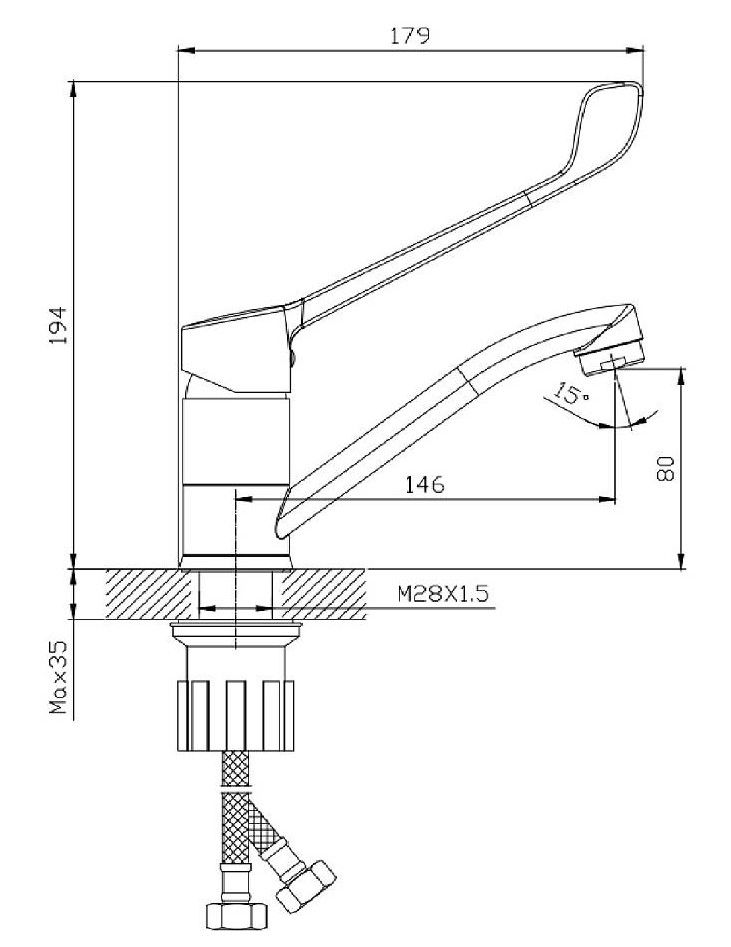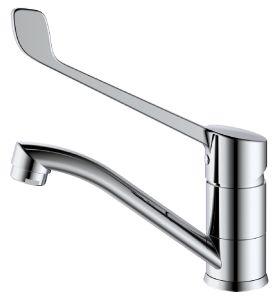 S08.45 Смеситель для раковины/мойки с хирургической ручкой локтевой, изготовлен из латуни, керамический картридж 35 мм, хром покрытие. Подводка 50 см, на усиленной гайке. Гарантия 5 лет.