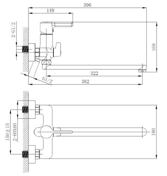 Керамический картридж 35 мм.Диаметр декоративных чашек 60 мм.Душевой гарнитур в комплекте.Межосевое расстояние (расстояние между выходом горячей и холодной трубы) 150 мм.Данное расстояние изменяется за счет входящих в комплект эксцентриков на 15 мм в большую или меньшую стороны.