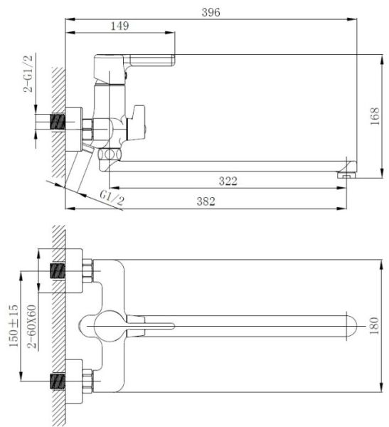 Керамический картридж 35 мм.Диаметр декоративных чашек 60 мм.Душевой гарнитур в комплекте.Межосевое расстояние (расстояние между выходом горячей и холодной трубы) 150 мм.Данное расстояние изменяется за счет входящих в комплект эксцентриков на 15 мм в большую или меньшую стороны.