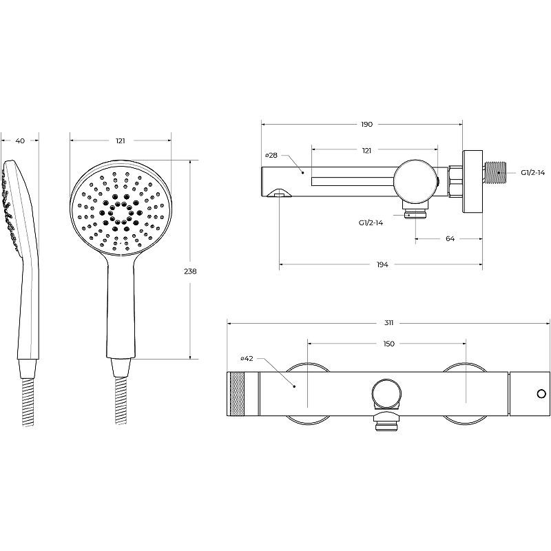 • Размер ручного душа: 23,8 х 12,1 х 4 см