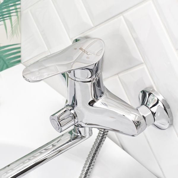 Однорычажный смеситель ТМ BOOU обладает стильным дизайном корпуса. Модель пре-красно впишется в интерьер современной ванной комнаты. Наличие длинного поворотного излива делает модель универсальной: она используется для обеспечения водой как ванны, так и раковины, актуально в небольшом санузле. В комплекте удобная трехрежимная лейка с гибким шлангом и настенный держатель.