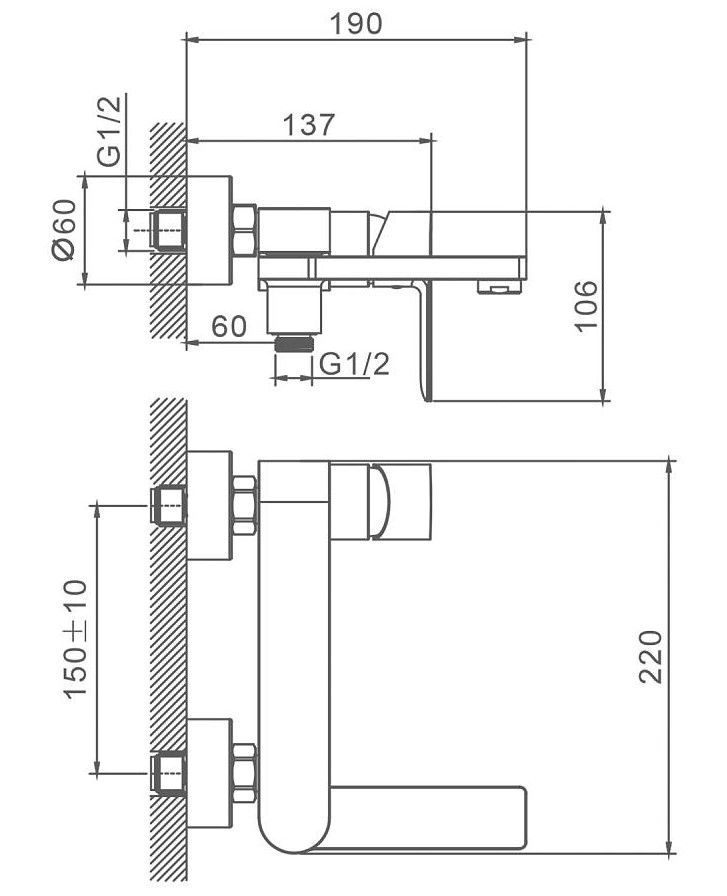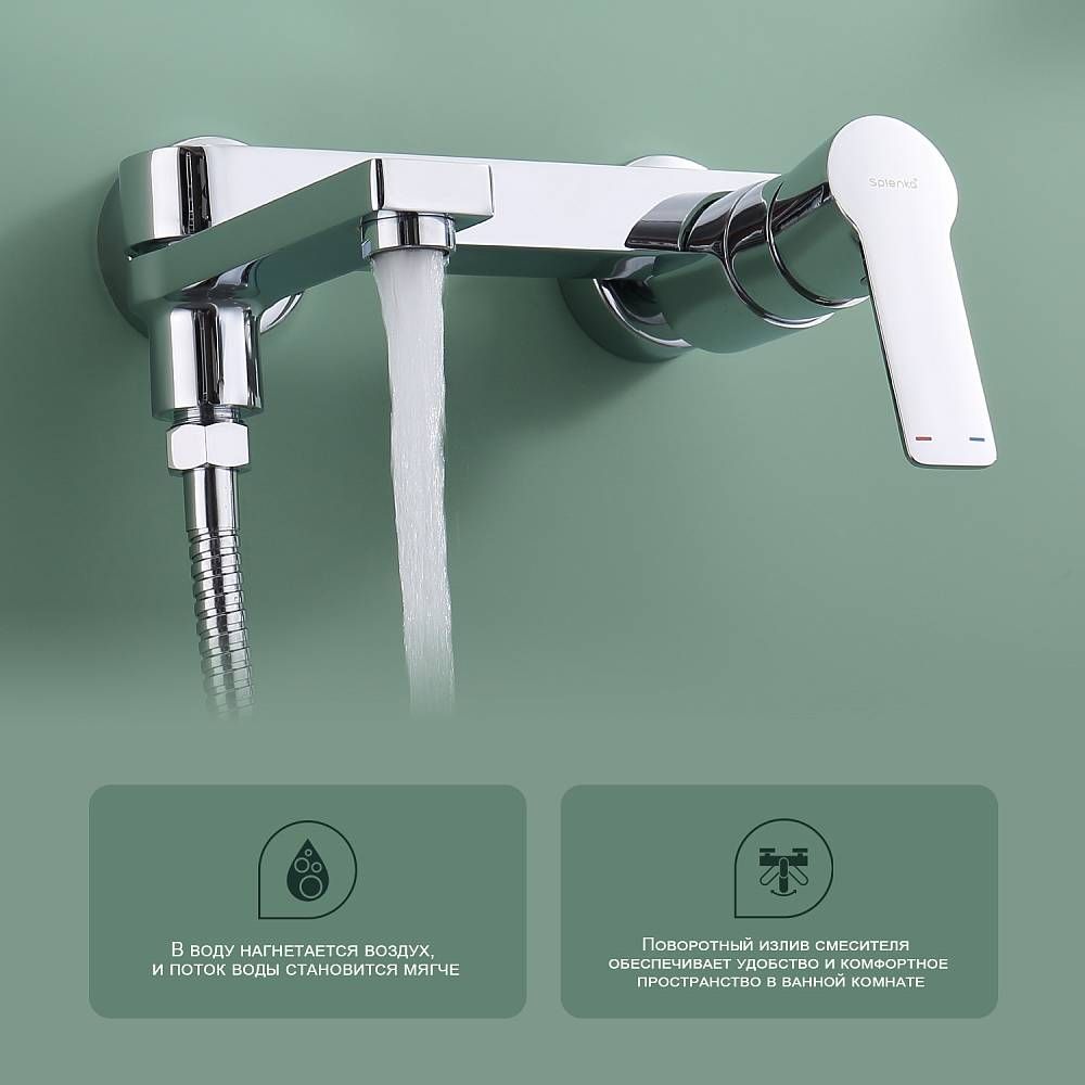 Смеситель для ванны Splenka S06.30, хром. Материал: латунь. Управление: однорычажное. Механизм: керамический картридж. Излив: поворотный. Стандарт подводки: G 1/2. Аэратор. Монтаж: на стену. Душевая лейка - 3 режима.