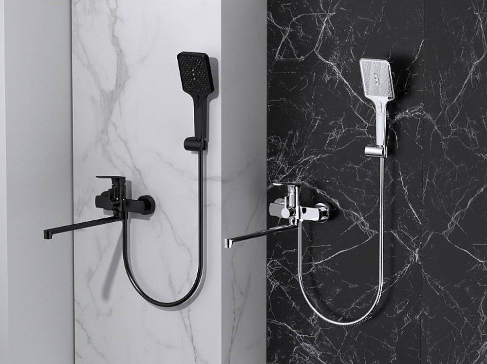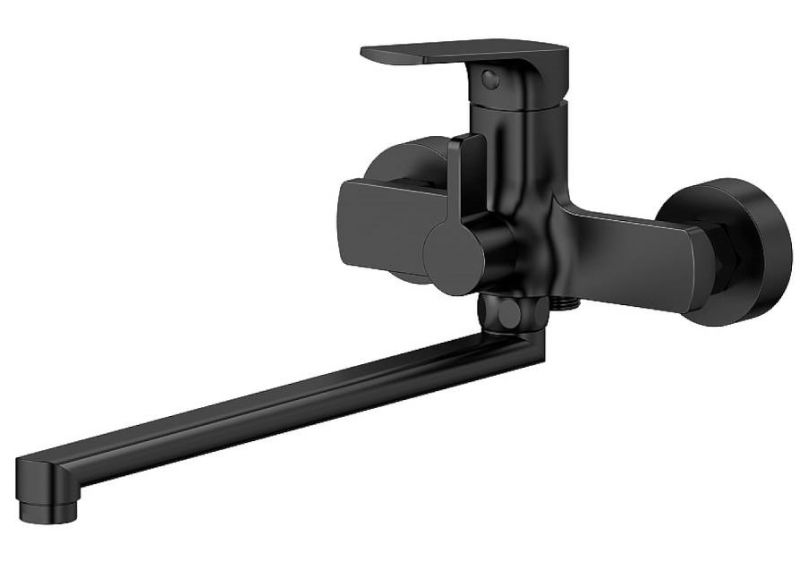 Смеситель для ванны Splenka S30.22.06 универсальный. Цвет: черный. Материал: латунь. Управление: однорычажное. Механизм: керамический картридж. Излив: поворотный. Стандарт подводки: G 1/2. Аэратор. Переключатель ванна/душ. Монтаж: на стену. Душевая лейка - 3 режима.