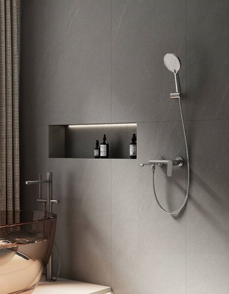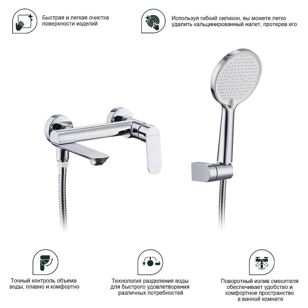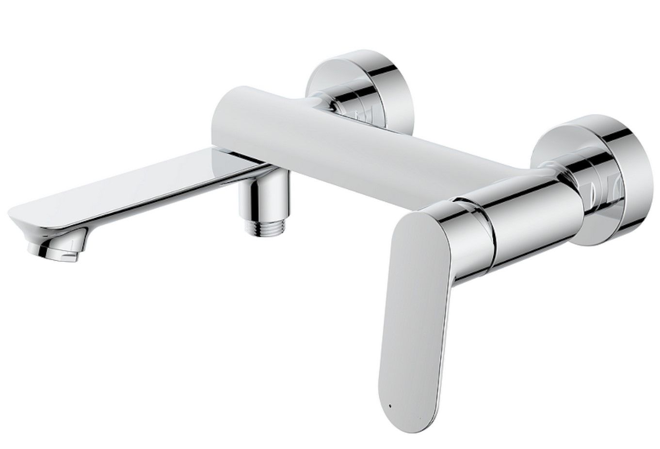 Смеситель для ванны Splenka S41.30. Цвет: хром. Материал: латунь. Управление: однорычажное. Механизм: керамический картридж. Излив: поворотный. Аэратор. Стандарт подводки: G 1/2. Отверстия для монтажа: 2. Монтаж: на стену. Душевая лейка - 3 режима.