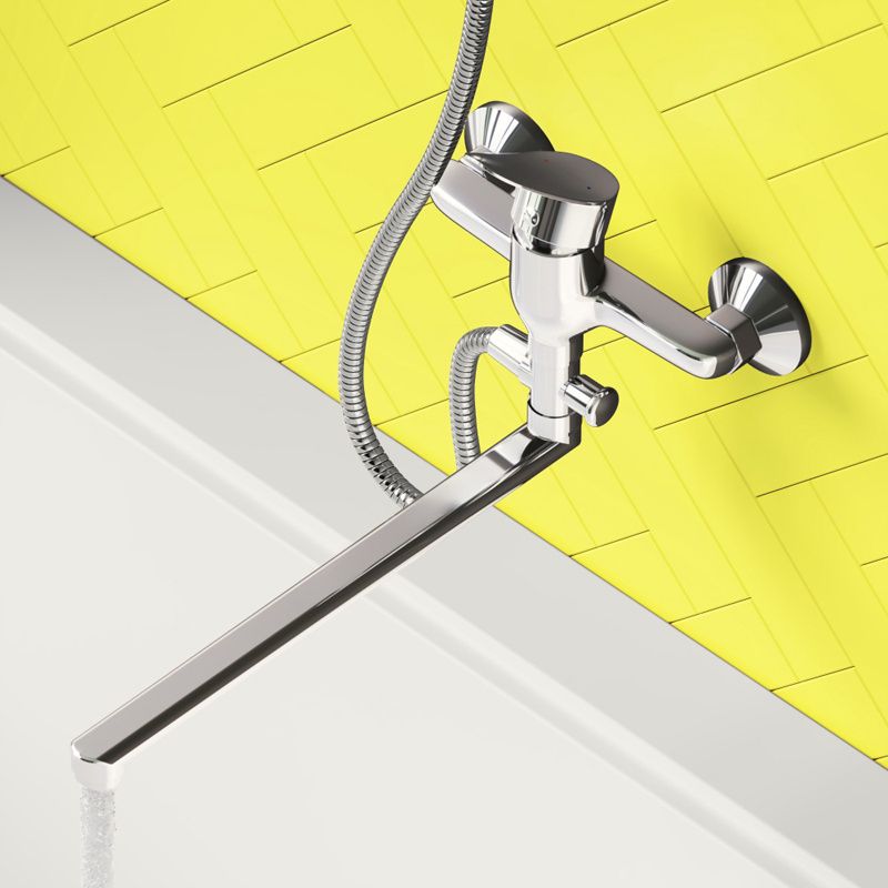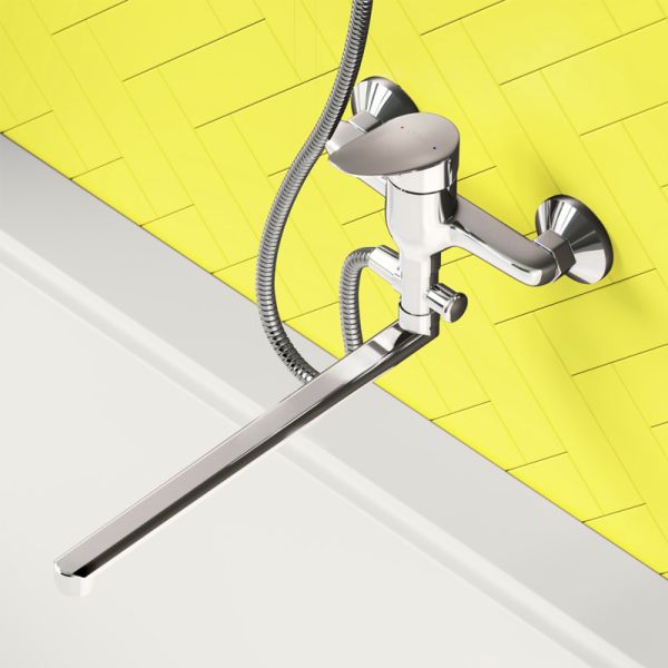 Смеситель для ванны и душа: излив поворотный, керамический картридж, в комплекте эксцентрики и декоративные розетки, душевой шланг 1500 мм, держатель (на два положения) и душевая лейка d 95 мм (1 режим).