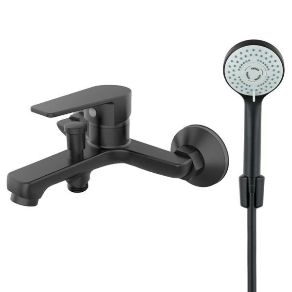 Однорычажный смеситель для ванны и душа Orange Loop с фиксированным изливом. Покрытие цвета матовый черный, за которым просто ухаживать мягкой салфеткой, нанесено методом порошковой окраски. Изделие снабжено долговечным керамическим картриджем, благодаря чему срок службы смесителя измеряется десятилетиями. Аэратор предотвращает разбрызгивание воды, делая струю мягкой. Модель из пищевой латуни отличается повышенной прочностью и износостойкостью. В комплекте душевой набор (душевая лейка 3 режима, шланг 1500 мм., настенный держатель лейки).
