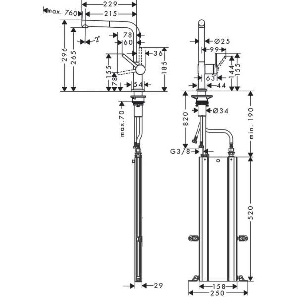 - • угол поворота излива: регулировка на 4 уровня 60 °, 110 °, 150 ° или 360 °