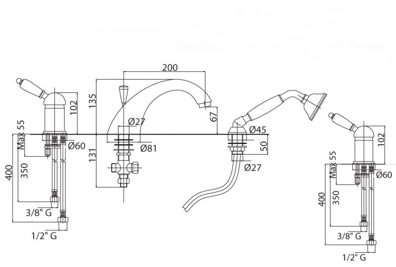 Оснащение: душевой шланг, душевая лейка, аэратор