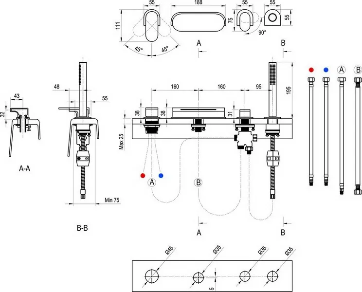 - исполнение: устанавливается на ванну с широким и горизонтальным бором; врезной на 4 отверстия; с лейкой;