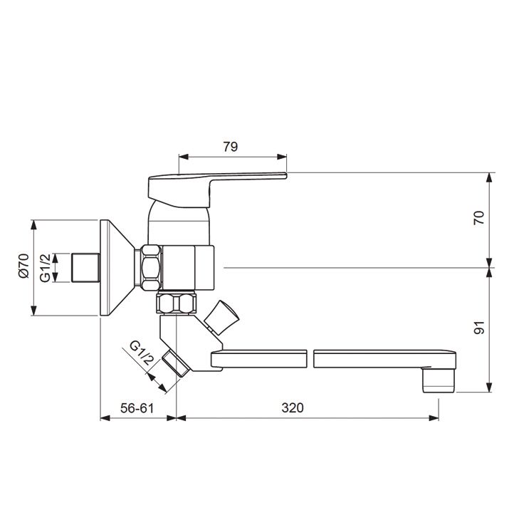 LOGIK Настенный смеситель для ванны/душа, поворотный излив 320 мм, душевой гарнитур в комплекте (лейка 70 мм, метал.шланг 1500 мм, держатель для лейки).