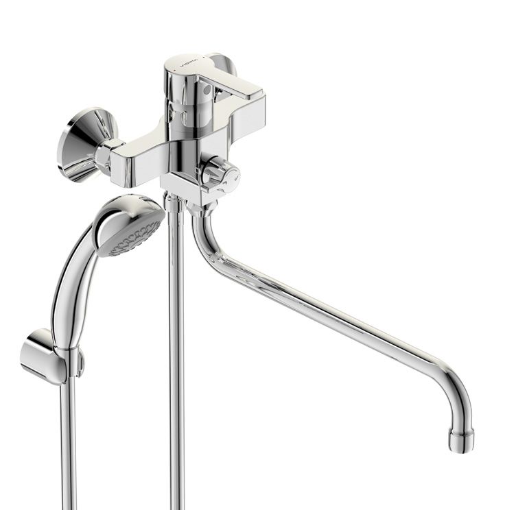 UNO Настенный смеситель для ванны/душа, поворотный излив 320 мм, душевой гарнитур в комплекте (душевая лейка 70 мм, металлический шланг 1500 мм, держатель для лейки).Смеситель однорычажный