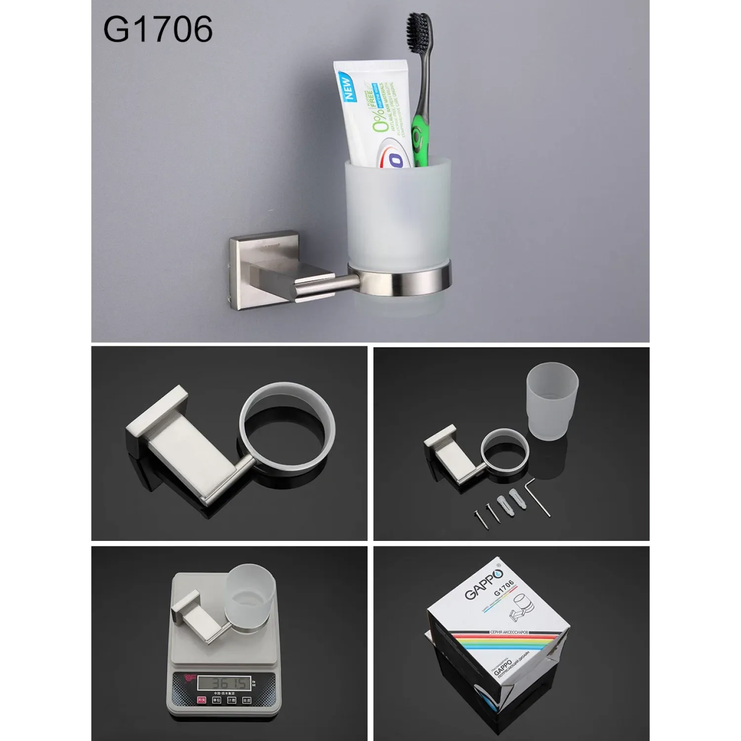 Настенный стакан с держателем в ванную Gappo G1706, стакан из стекла, держатель из нержавеющей стали, цвет сатин.