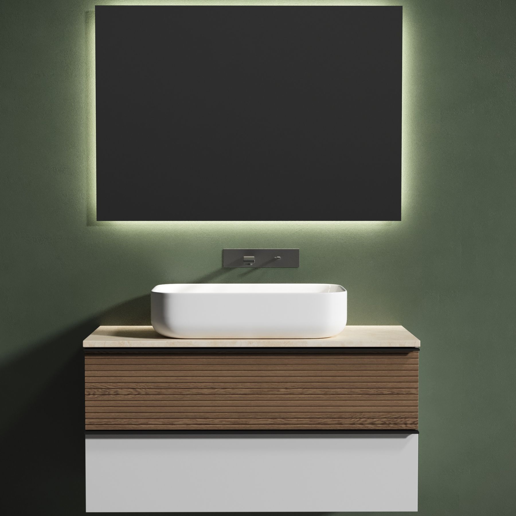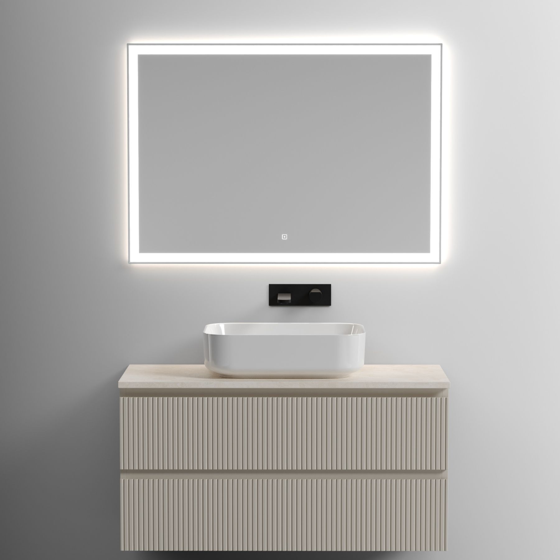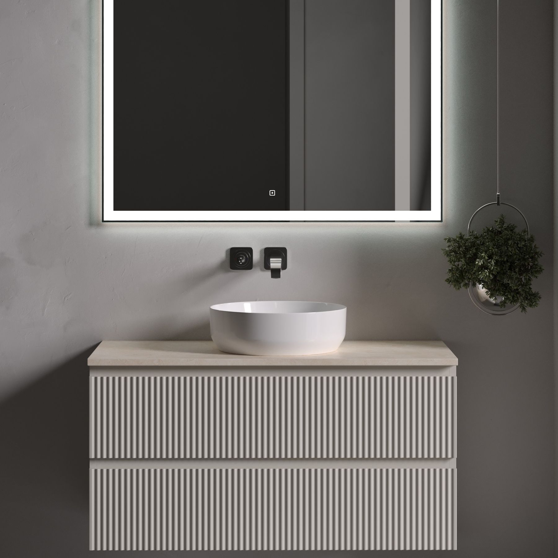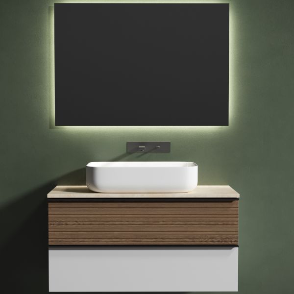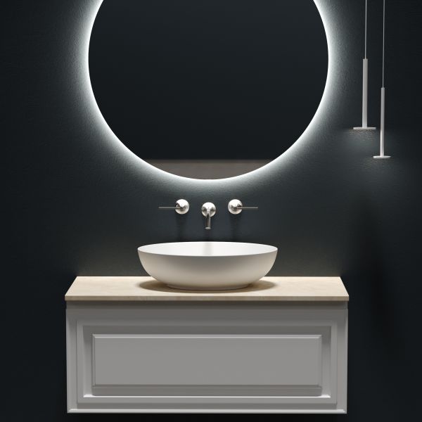 Столешница для ванной комнаты из керамогранита, для установки на подвесную тумбу. C готовым отверстием для установки накладной раковины. Без заранее просверленного отверстия под смеситель.
