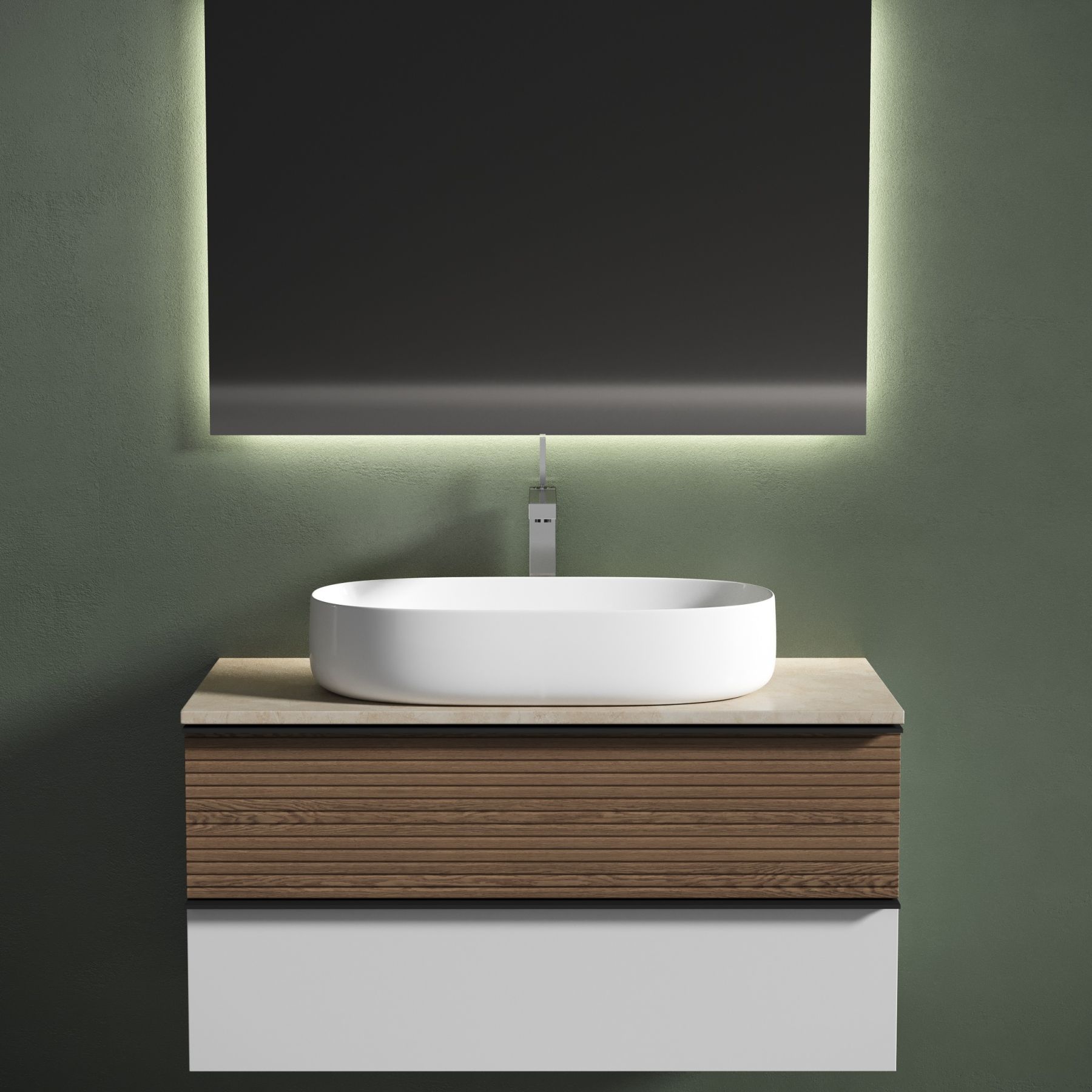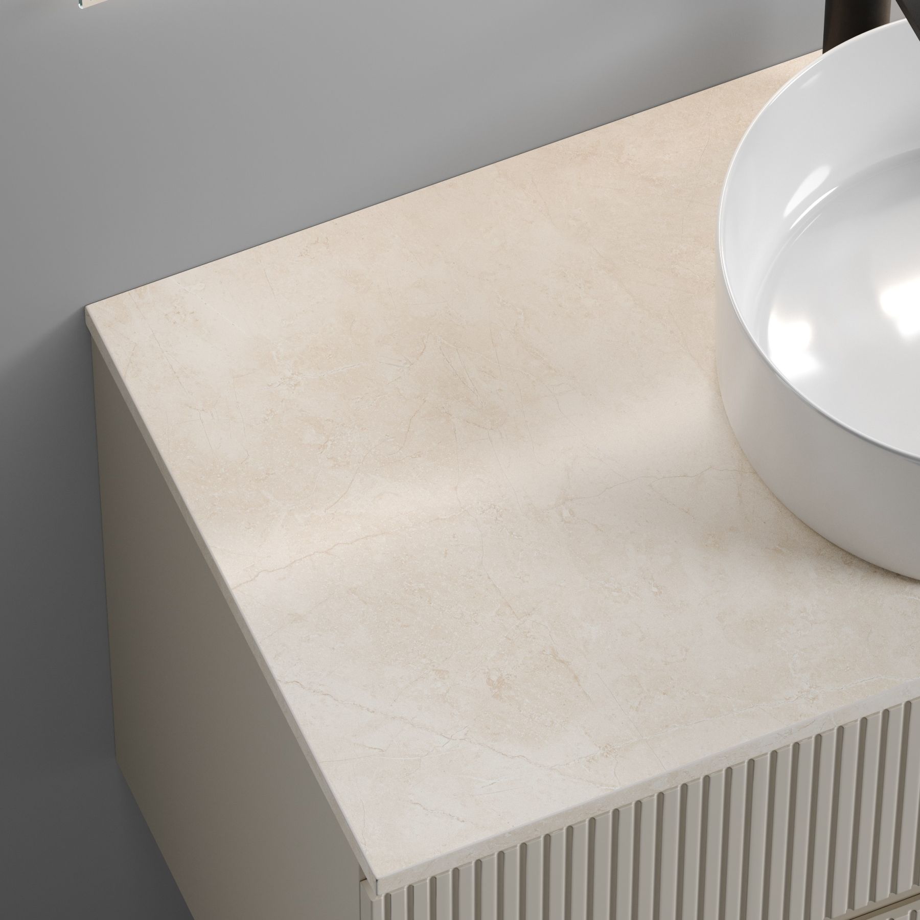 Столешница для ванной комнаты из керамогранита, для установки на подвесную тумбу. C готовым отверстием для установки накладной раковины. С заранее просверленным отверстием под смеситель.
