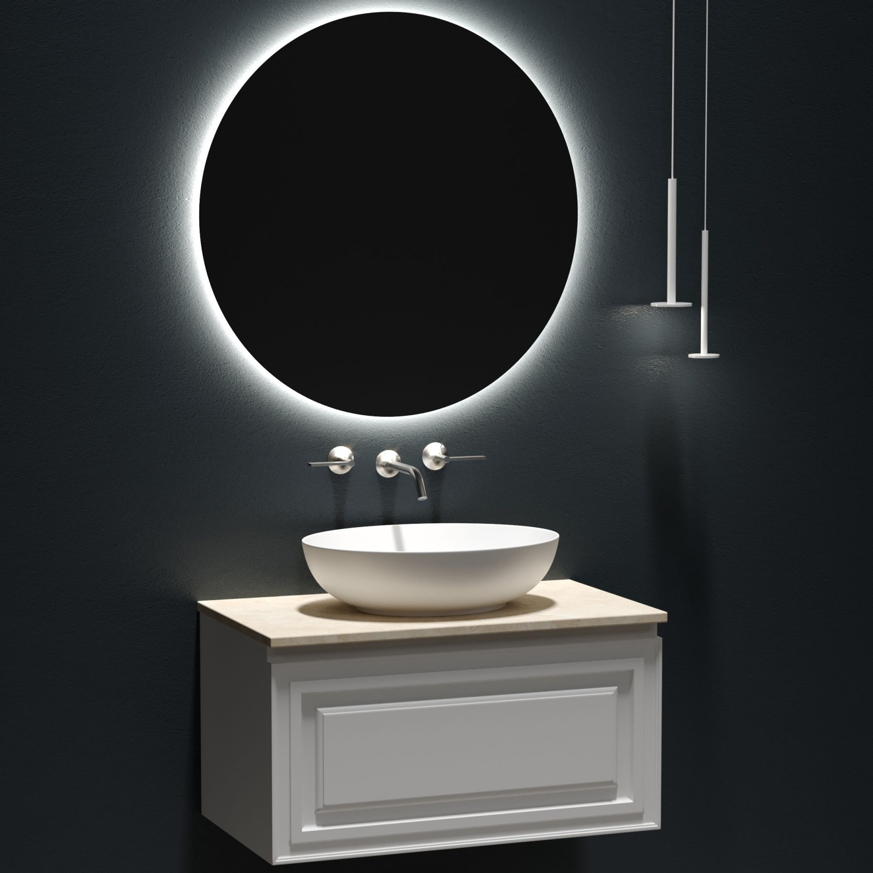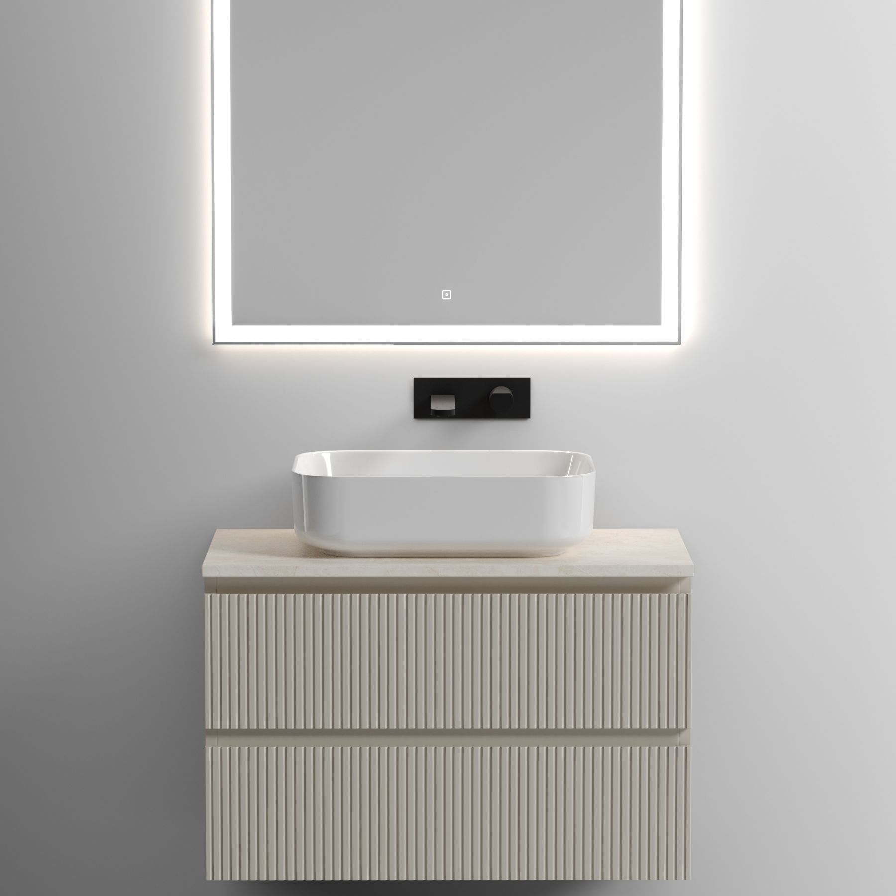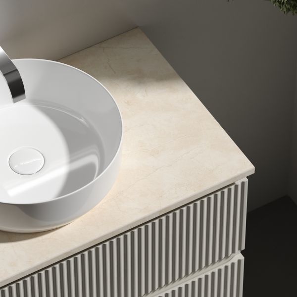 Столешница для ванной комнаты из керамогранита, для установки на подвесную тумбу. C готовым отверстием для установки накладной раковины. Без заранее просверленного отверстия под смеситель.