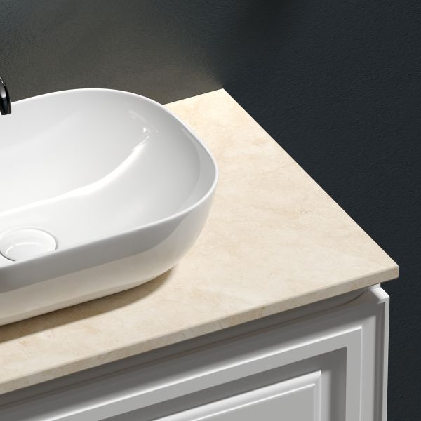 Столешница для ванной комнаты из керамогранита, для установки на подвесную тумбу. C готовым отверстием для установки накладной раковины. С заранее просверленным отверстием под смеситель.
