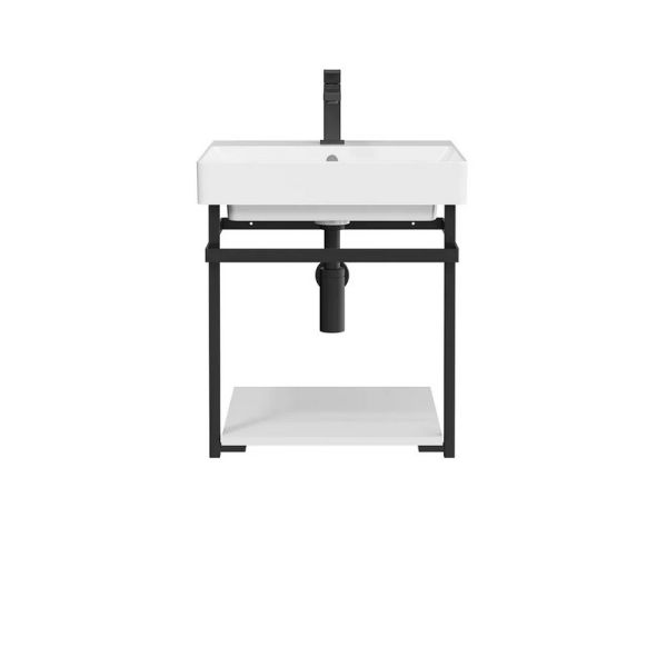 Стильная металлическая структура, окрашенная в чёрный матовый цвет, — интересная альтернатива привычной тумбе. Предназначена для установки раковины PRO шириной 50 см. Белая матовая полка из окрашенного ЛДСП заказывается отдельно.