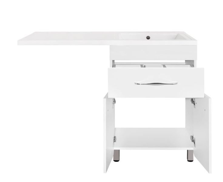 Тумба напольная бренда "Style Line" коллекции "Валеро" со стильными хромированными ручками. Направляющие полного выдвижения Hettich; сборка изделия с помощью эксцентриковых стяжек Hafele; все материалы полностью влагостойкие. Данная тумба предусматривает открытую подводку воды
