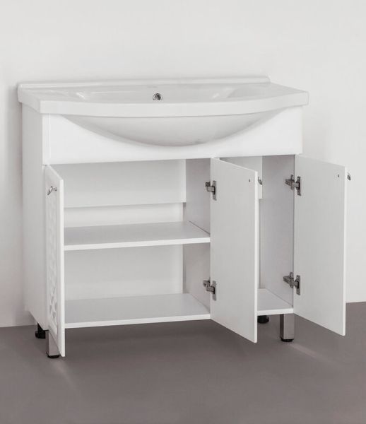 Тумба напольная бренда "Style Line" коллекции "Канна" с современной 3D фрезеровкой фасада, которая придает мебели индивидуальность и особый колорит. Фурнитура - хром, петли на дверцах с механизмом плавного закрывания. Направляющие полного выдвижения Hettich обеспечивают плавность и бесшумность хода, высокую надежность и прочность. Данная тумба предусматривает открытую подводку воды