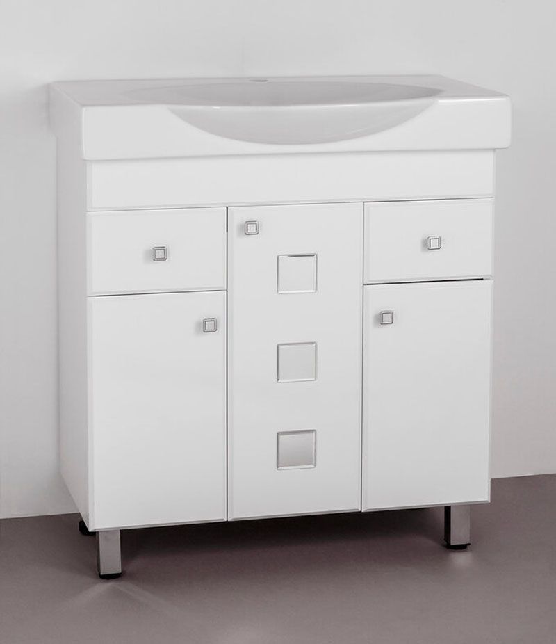 Тумба напольная "Крокус" с декоративными зеркальными вставками на фасаде,края которых обработаны фацетом. Фурнитура - хром, ручки "мозаика", петли на дверцах с механизмом плавного закрывания. Направляющие полного выдвижения Hettich, обеспечивающие плавность и бесшумность хода, высокую надежность и прочность. Данная тумба предусматривает открытую подводку воды