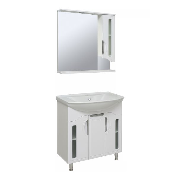 Зеркальный шкаф оборудован одним врезным светодиодным светильником 220В и розеткой с выключателем. Справа - шкафчик с распашным фасадом со стеклянной вставкой. Внутри - одна встроенная полочка. Петли со встроенным доводчиком, ручка врезная- 1шт. Выпускается только в правом исполнении.