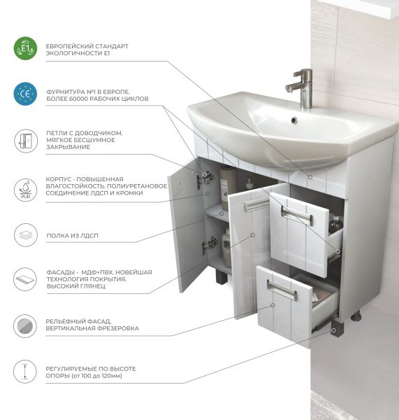 Оснащение: 2 дверцы; 2 ящика; 1 полка ЛДСП; ручка металлическая хромированная;опоры квадратные регулируемые.