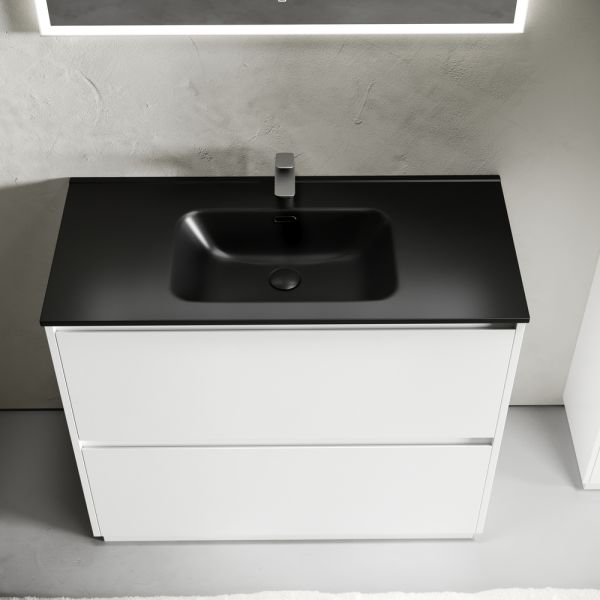Тумба напольная Libra c двумя ящиками с доводчиками скрытого монтажа, с системой плавного закрывания и с ручкой по всей длине ящика. Каркас и фасад тумбы выполнен из МДФ, покрытие эмаль, цвет белый глянец. Основание тумбы имеет ножки c регулировкой высоты до10 мм для компенсации возможной неровности напольного покрытия. Внутреннее пространство тумбы выполнено из надежного ЛДСП серого цвета. Размер 990х450х840, артикул LB100FW.