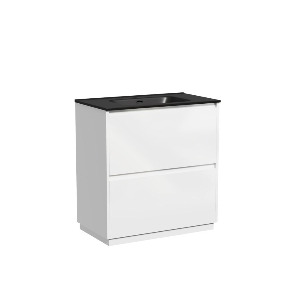 Тумба напольная Libra c двумя ящиками с доводчиками скрытого монтажа, с системой плавного закрывания и с ручкой по всей длине ящика. Каркас и фасад тумбы выполнен из МДФ, покрытие эмаль, цвет белый глянец. Основание тумбы имеет ножки c регулировкой высоты до10 мм для компенсации возможной неровности напольного покрытия. Внутреннее пространство тумбы выполнено из надежного ЛДСП серого цвета. Размер 790х450х840, артикул LB80FW.