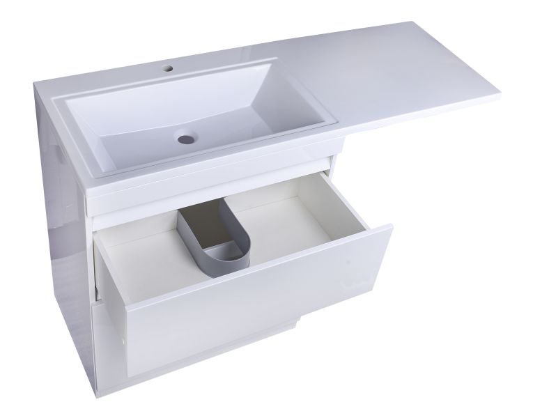 Тумба коллекции Даллас выполнена в современном стиле с преобладанием прямых строгих линий в дизайне. Она сочетает в себе функциональность и обеспечит удобное хранение ванных принадлежностей. Для размещения ванных аксессуаров в тумбе предусмотрено три выдвижных ящика. Особенностью модели является возможность установки под нее стиральной машины. Тумба отлично впишется в интерьер ванной комнаты в современном дизайне.
