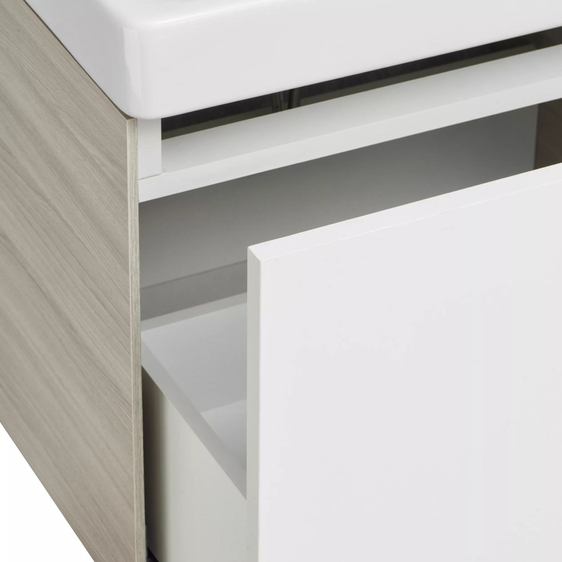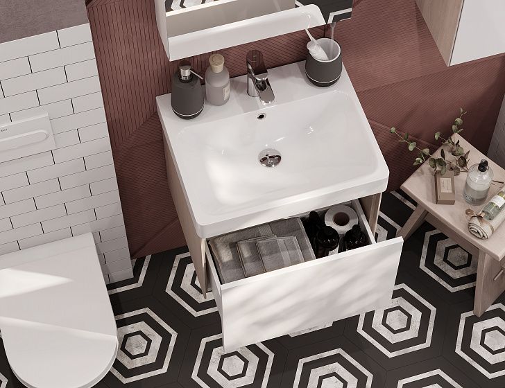 Белые фасады тумбы под раковину Асти 55 идеально сочетаются с боковыми стенками, выполненными в сдержанной древесной отделке Ясень Шимо Светлый: особенно органично она будет смотреться в интерьерах с отсылками к скандинавской эстетике. Сочетание цветов (белый глянец и ясень шимо) в коллекции АСТИ позволяет использовать мебель в современных интерьерах. Ящик тумбы оснащен механизмом Push-to-Open, гарантирующим плавное открывание и закрывание. Отличительная особенность мебели из коллекции - боковые стенки, при изготовлении которых используется особая инновационная технология. Благодаря ей создается эффект визуально тонких боковых линий, однако конструкция при этом остается надежной и прочной. Пространство для хранения в ящике тумбы можно организовать так, как удобно именно вам. Тумбы АСТИ комбинируются с раковиной Адриана бренда Santek.